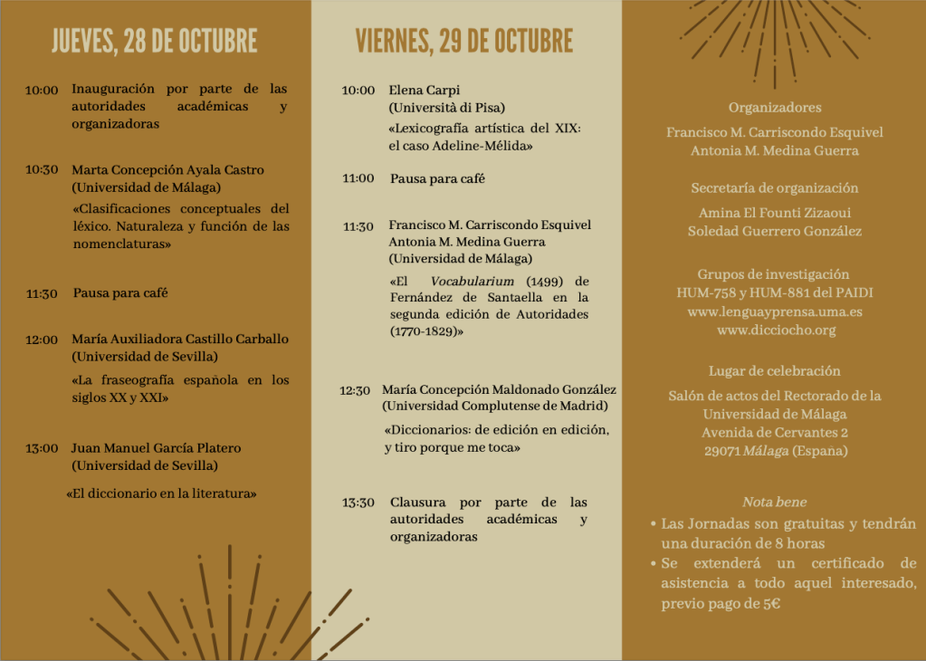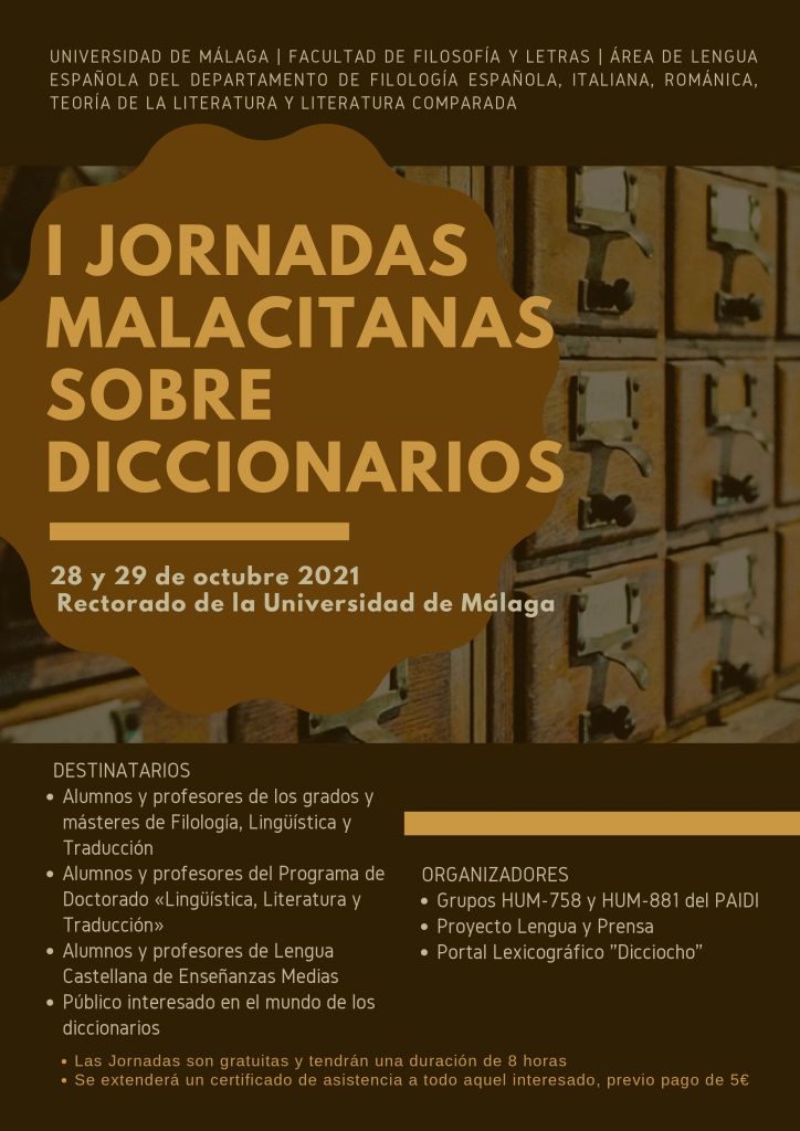 Los diccionarios vuelven a Málaga, ciudad que ha sido siempre un referente en la redacción y estudio de diccionarios para la lengua española. De la mano de maestros como el llorado Manuel Alvar Ezquerra (1950-2020) y sus discípulos, hubo una época gloriosa en la que, por ejemplo, se elaboraron los famosos diccionarios Vox de la editorial Biblograf; o se celebró el IV Congreso Internacional de la Asociación Europea de Lexicografía (EURALEX 90). Es ahora cuando los responsables de los contenidos lexicográficos de los grados y másteres de Lengua Española de la Universidad de Málaga han decidido recuperar aquel espíritu emprendedor y evocar, si no la elaboración de nuevos productos lexicográficos, al menos su análisis desde una perspectiva histórica. Es así como se justifica la celebración de estas I Jornadas Malacitanas sobre Diccionarios.